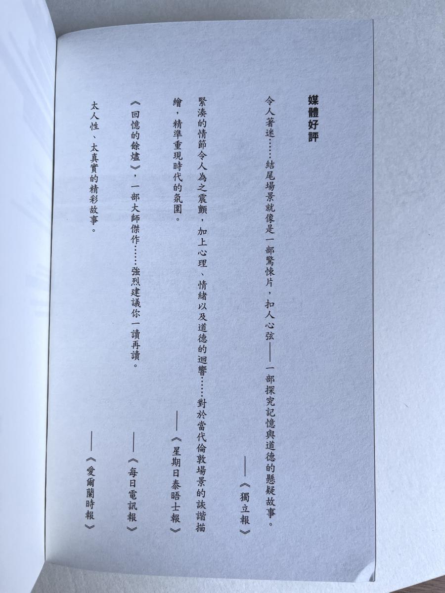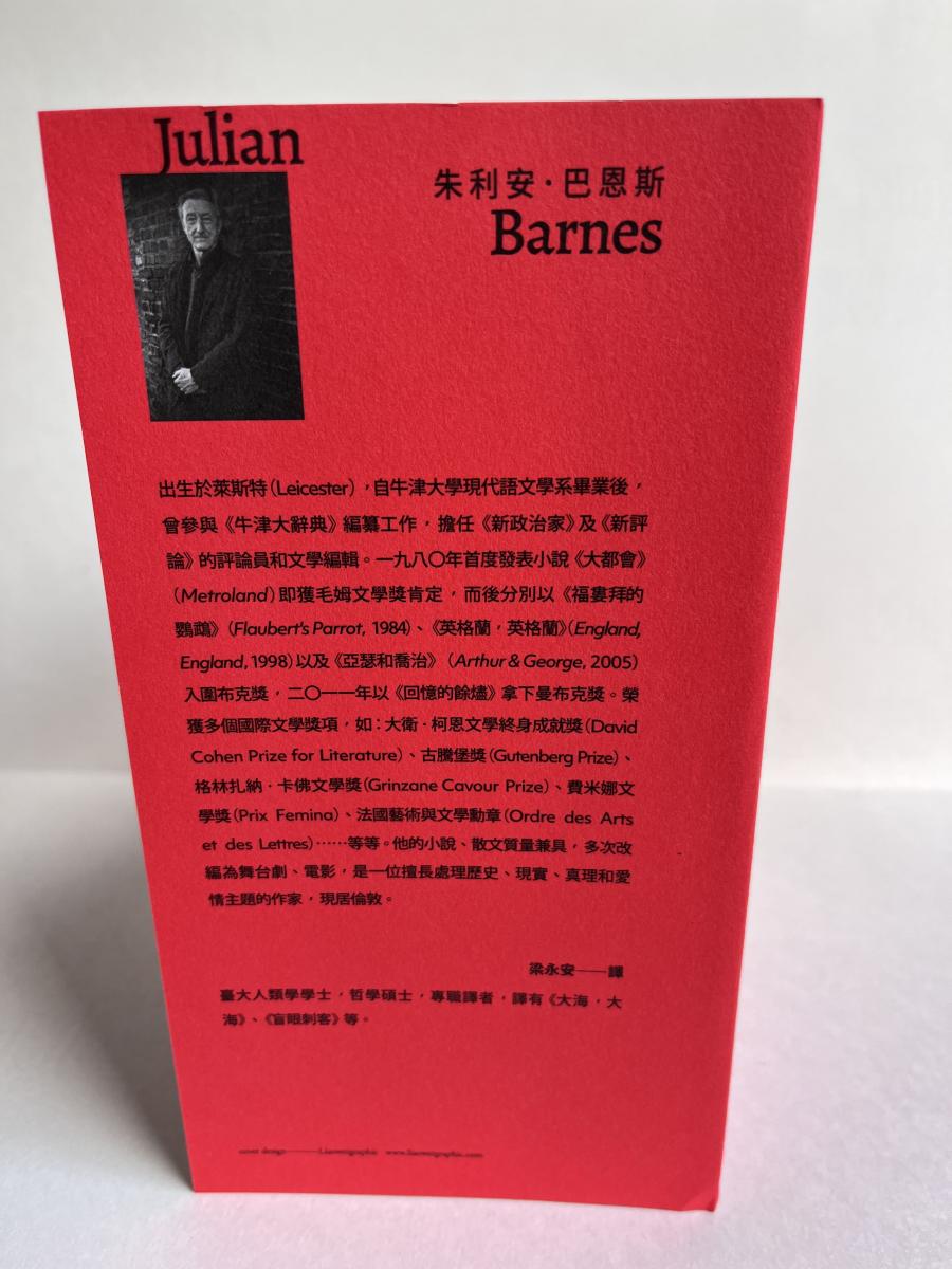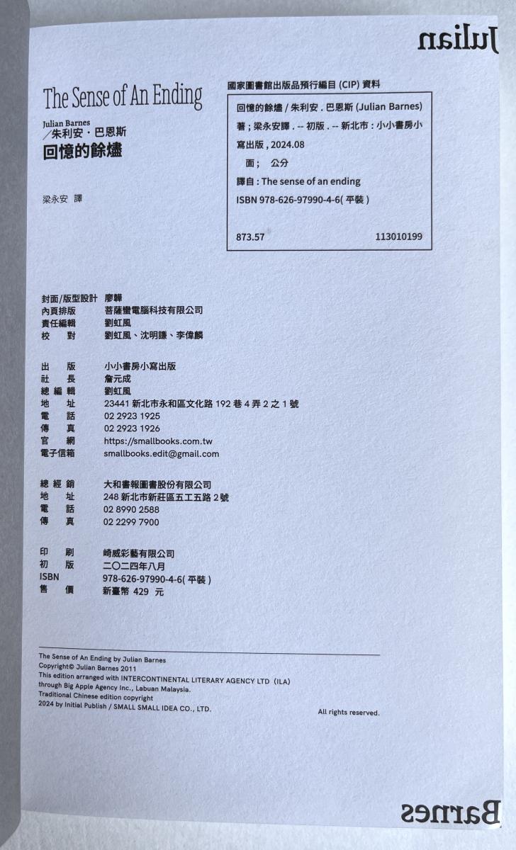 Notes on this edition: Julian Barnes | 朱利安.回憶的餘燼 | The Sense of an Ending. 小寫創意 | Small Small Idea, 2024. Pp. 268 + [4]. 18.7 x 12 cm. Translated by 梁永安. ISBN: 9786269799046. (Traditional Chinese).