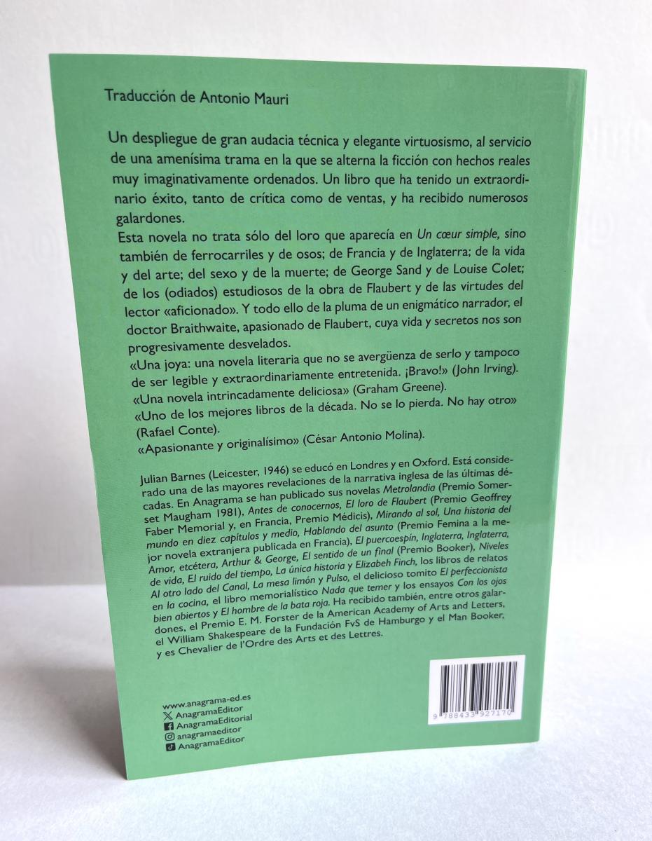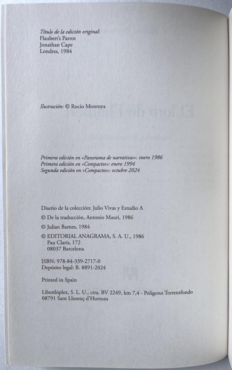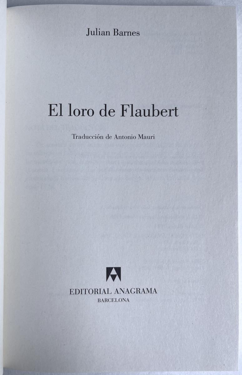 Notes on this edition: Julian Barnes. El loro de Flaubert | Flaubert’s Parrot. Barcelona: Editorial Anagrama, 2024. Pp. 228 + [4]. 20.4 x 13.4 cm. Translated by Antonio Mauri. ISBN: 9788433927170. (Spanish).