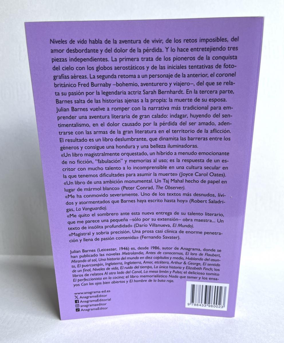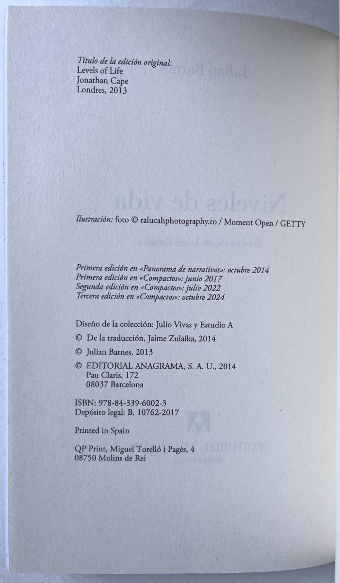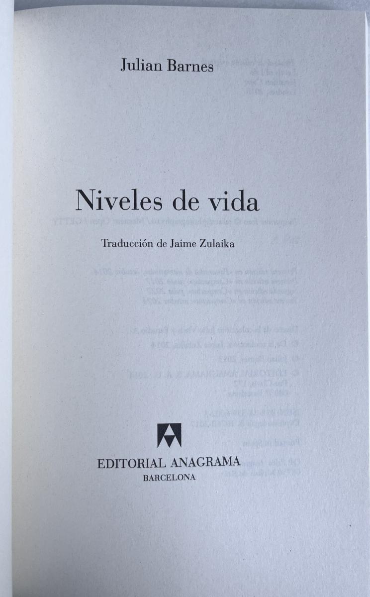 Notes on this edition: Julian Barnes. Niveles de vida | Levels of Life. Barcelona: Compactos Anagrama, 2024. Pp. 143 + [9]. 20.5 x 13.4 cm. Translated by Jaime Zulaika. ISBN: 9788433960023. (Spanish).