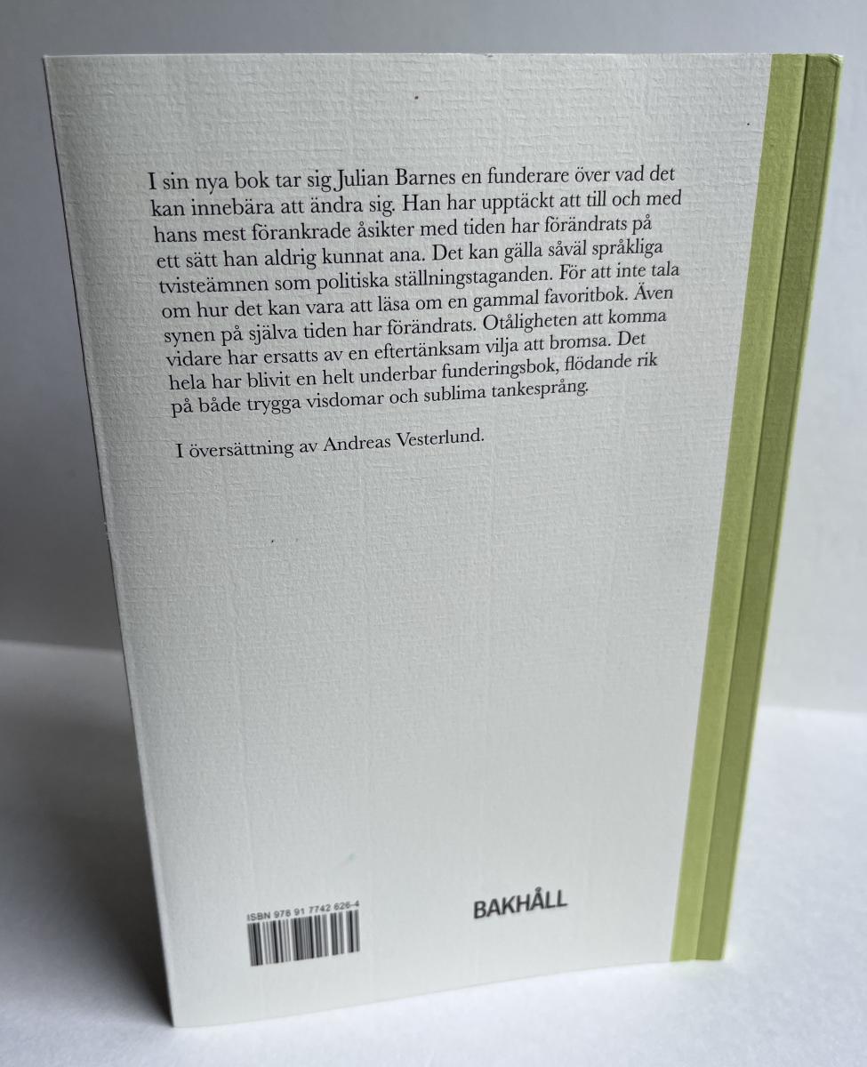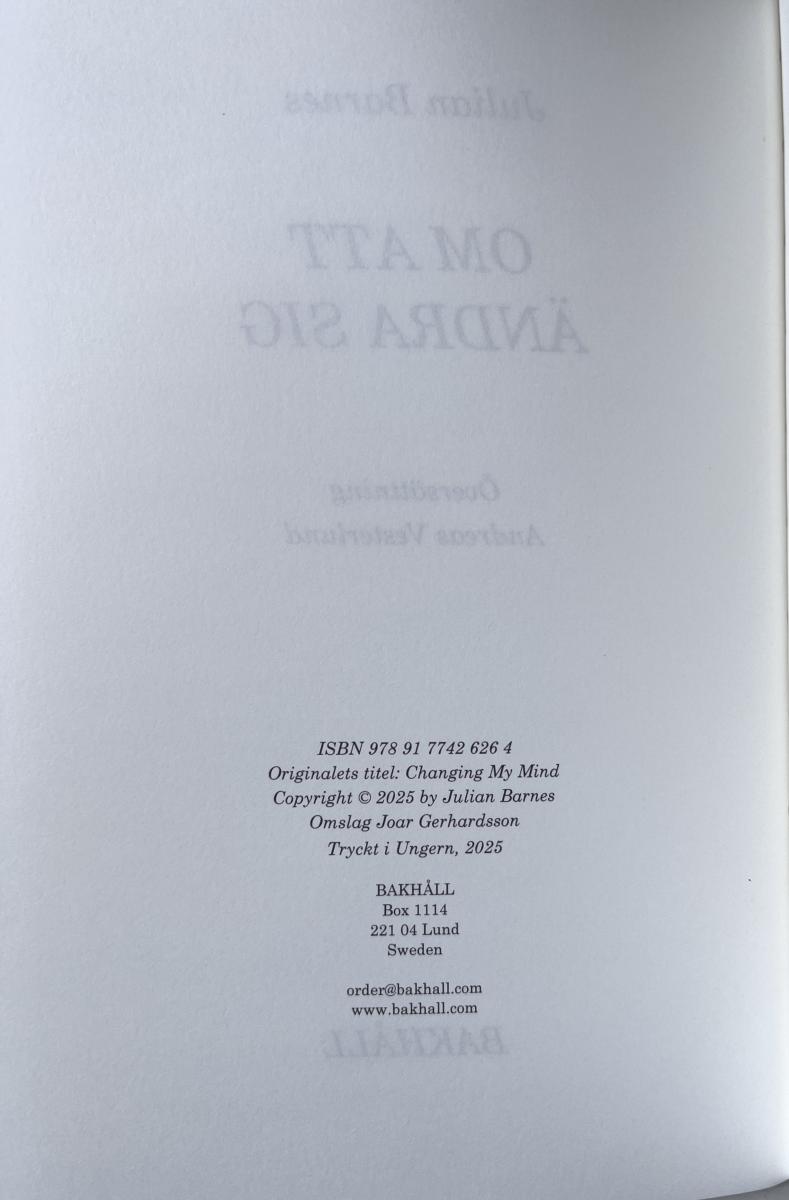 Notes on this edition: Julian Barnes. Om att ändra sig | Changing My Mind. Bakhåll, 2025. Pp. 74 + [6]. 20.7 x 13.6 cm. Translated by Andreas Vesterlund. ISBN: 9789177426264. (Swedish).