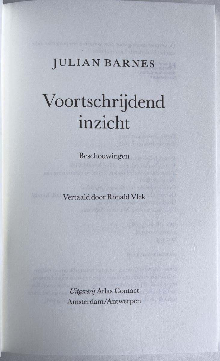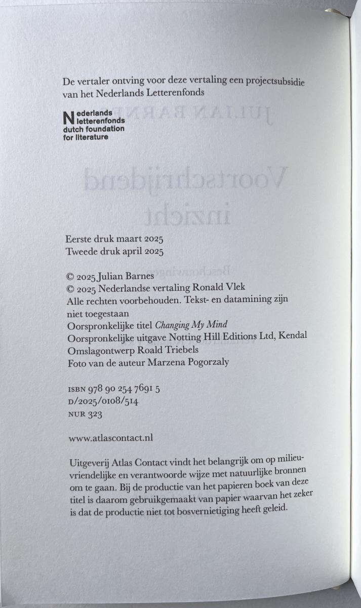 Notes on this edition: Julian Barnes. Voortschrijdend inzicht | Changing My Mind. Amsterdam/Antwerpen: Atlas Contact, 2025. Pp. 84 + [12]. 20.5 x 13.1 cm. Translated by Ronald Vlek. ISBN: 9789025476915. (Dutch).