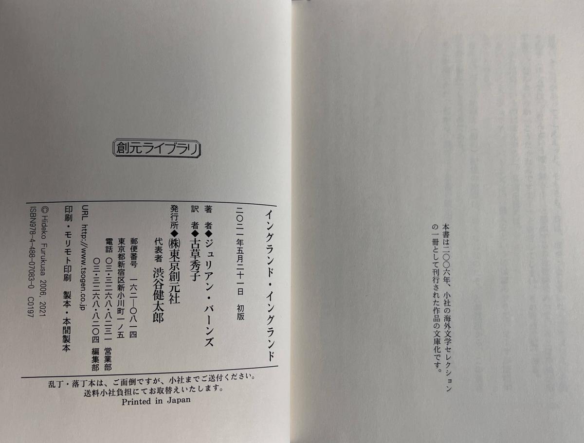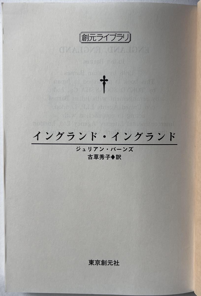 Notes on this edition: イングランド・イングランド | England, England. 東京: 東京創元社 [Tokyo: Sōgensha], 2021. Pp. 394 + [2]. 14.9 x 10.5 cm. Translated by 古草 秀子 [Hideko Furukusa]. ISBN: 9784488070830. (Japanese).